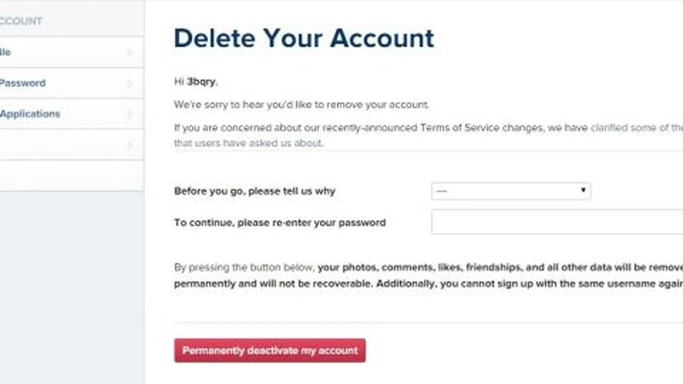 - ثم بعد ذلك ستظهر للمستخدم نافذة تطلب منه تحديد سبب قيامه بحذف الحساب، وإعادة إدخال الرقم السري الخاص بحسابه، وبعد تحديد السبب، وإدخال الرقم السري، عليه اختيار الخيار التالي الموجود على نفس النافذة: (Permanently deactivate my accout)، وبعد النقر على هذا الخيار، سيتم حذف الحساب نهائيًا.