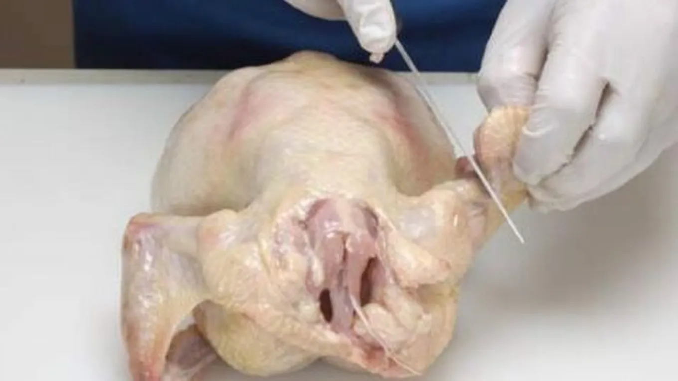 - تُفحص الدجاجة للتأكد من أن الكلى لا تزال سليمة، عن طريق النظر في تجويف الدجاجة البطني، حيث يجب أن تكون الكلى ذات لون أحمر غامق في الجزء الخلفي من الدجاجة، وبعد التأكد منها تُزال بالأصابع.