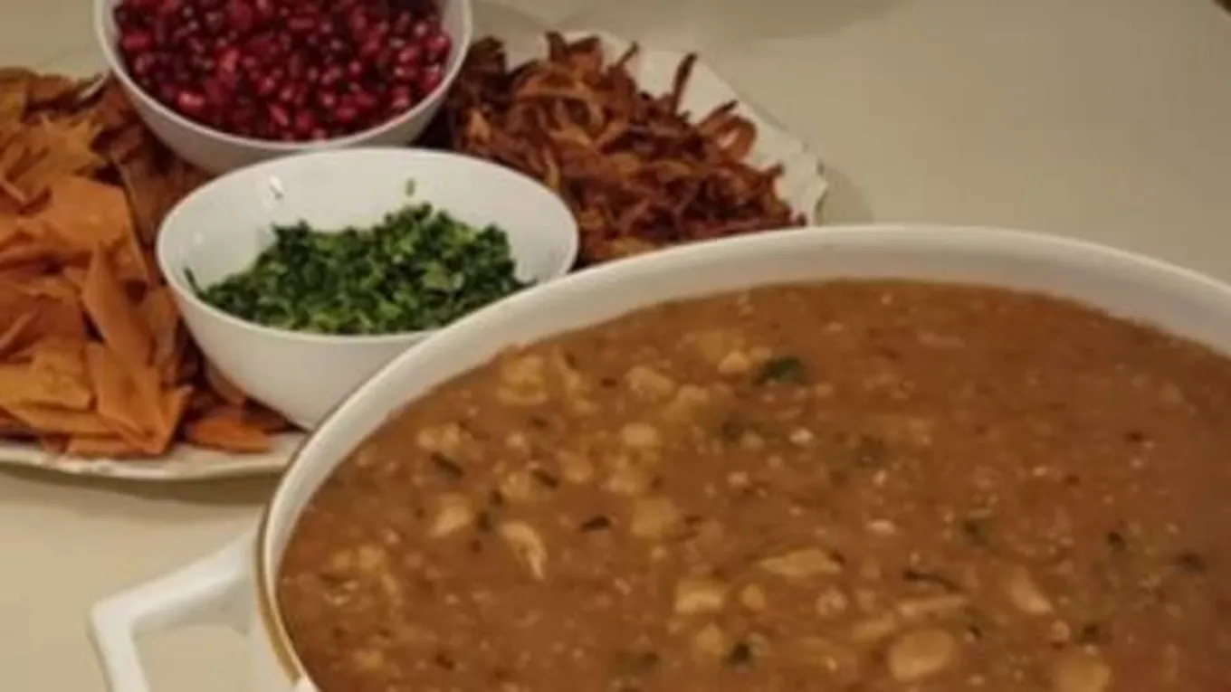 - زيّني وجه الطبق بقطع الخبز المقليّة، والكزبرة والثوم، وحبوب الرمان، والبصل المقلي، وقدميه إلى جانب المخللات والجرجير.