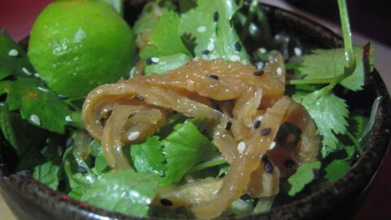 - غسل شرائح قنديل البحر بالماء جيداً ومن ثم تجفيفه ووضعه في وعاء عميق جانباً.
