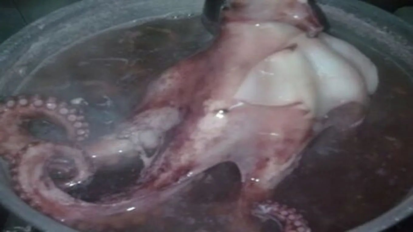 - إضافة الأخطبوط إلى القدر تدريجيّاً، وستنخفض درجة حرارة الماء عندَ إضافة الأخطبوط لذلِكَ يجب جعله يغلي مرّةً أُخرى.