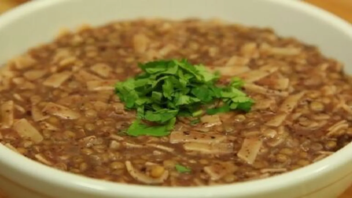- قلي البصل في الزيت الساخن حتى يذبل، ثمّ إضافة اللحمة، والكمون، والملح، والفلفل الأسود، والعدس، والماء، ثمّ تغطية الخليط وتركه على نار هادئة لمدة عشر دقائق حتى تنضج المكوّنات.