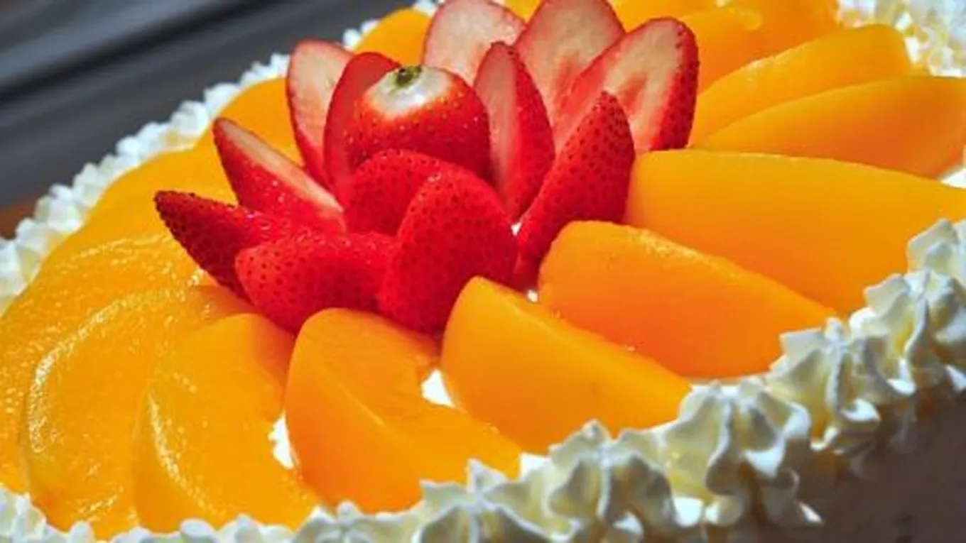 - ضعي الخوخ والكرز على الكيك، ورتّبيه على وجهِه بشكلٍ دائريّ.
