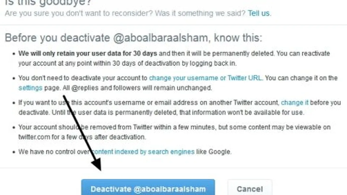 - يمَكّن تويتر مستخدميه من حذف حساباتهم بشكل مؤقّت لمدّة ثلاثين يوماً قبل أن يقوم بحذف الحساب نهائيّاً، وحذف البيانات المخزّنة فيه.