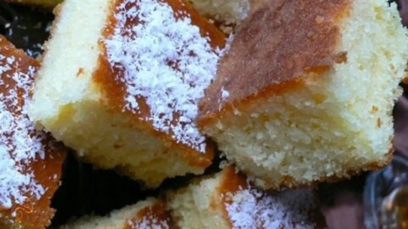 - نُخرج صينية الكيك من الفرن، ثمّ نسكب القطر عليها إلى أن يتشرب الكيك القطر، ثم نُزينه بجوز الهند.