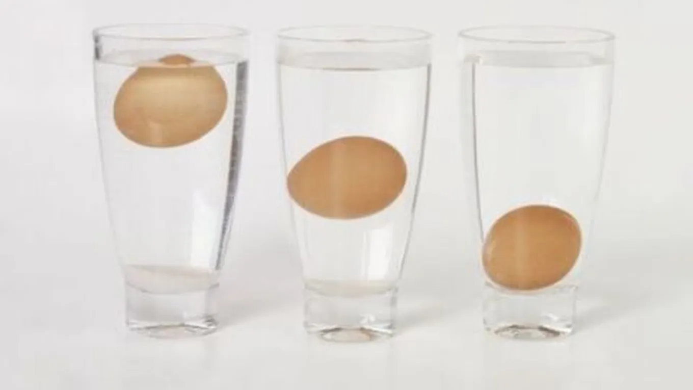 - وضع البيضة في وعاء مملوء بالماء، وفي حال طفو البيضة على سطح السائل فإن هذا يعني فساد البيض؛ إذ إنه ومع تقدم الزمن يتسرّب الهواء داخل البيضة مسبباً مساحة هوائية كبيرة داخلها، مما يؤدي إلى طفوها.