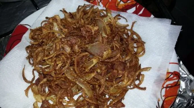 - انتشلي البصل عند الحصول على لونٍ ذهبيّ وقرمشةٍ رائعةٍ، وضعيه على الورق النشّاف ليمتص الفائض من السّمن.