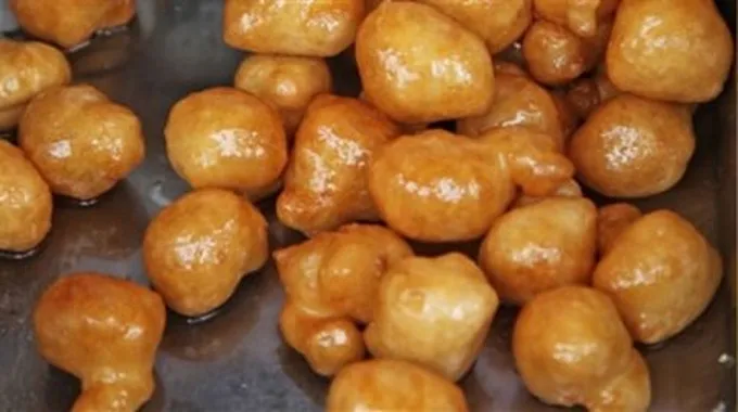 - نضع الزيت في مقلاة عميقة ونسخنه، ثم نمسك العجينة باليد ونستخدم ملعقة طعام وندهنها بالزيت من وقت لآخر، ونقطع العجينة إلى كريات صغيرة الحجم ونقليها في الزيت.