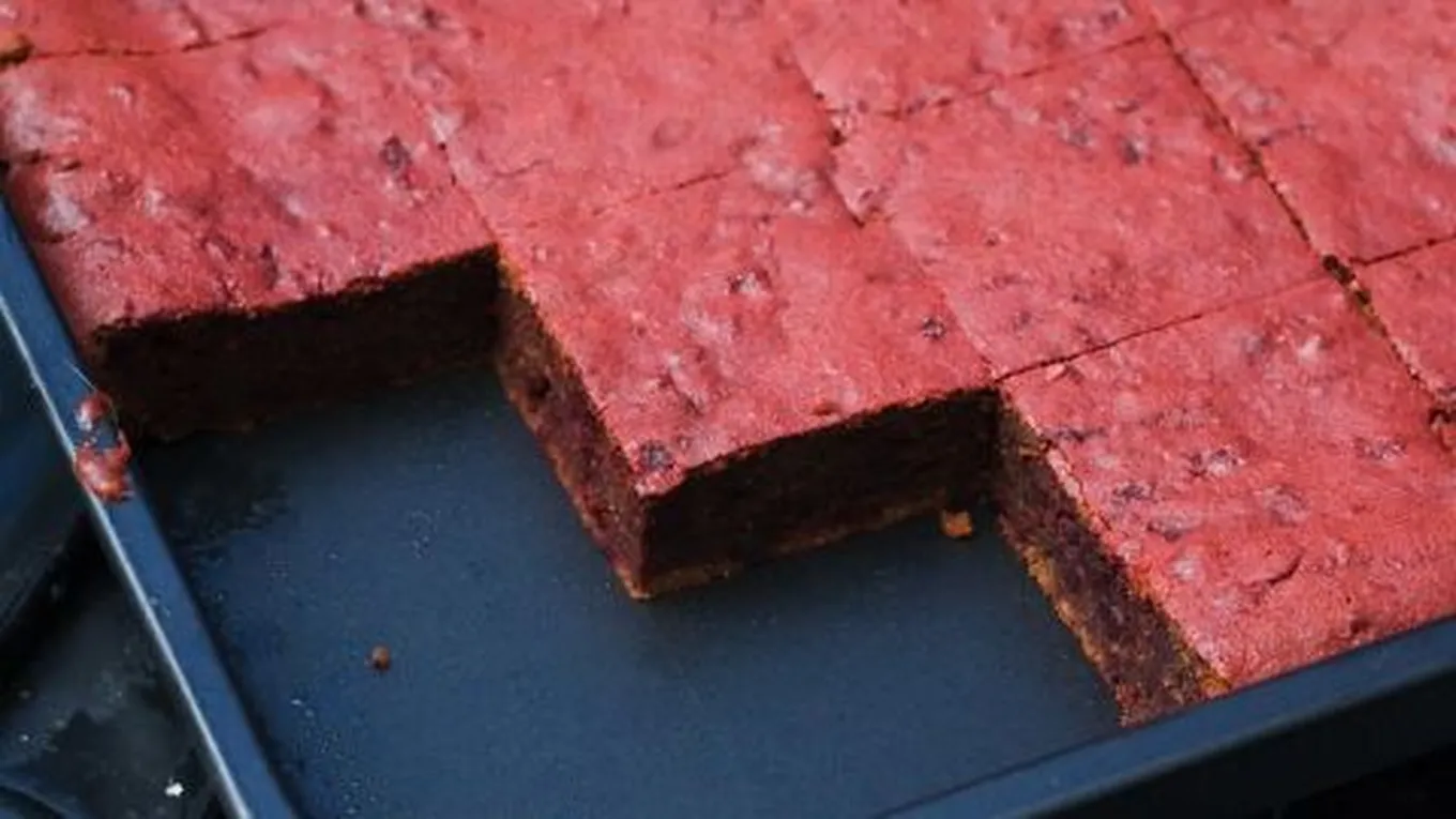 - وضع الكيك في طبق تقديم واسع ثمّ توزيع صلصة الشمندر فوقه.