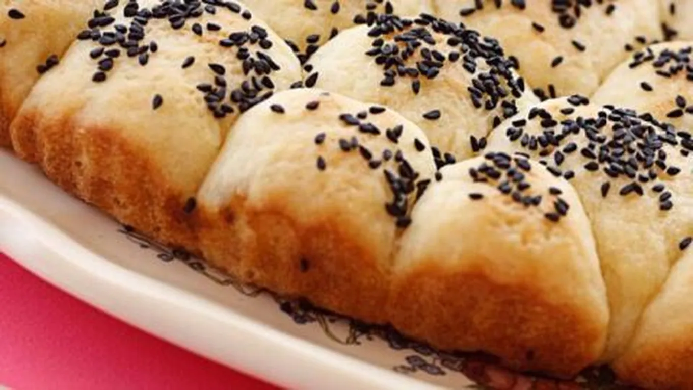 - ننثر بذور السمسم على وجه صينية خلية النحل.