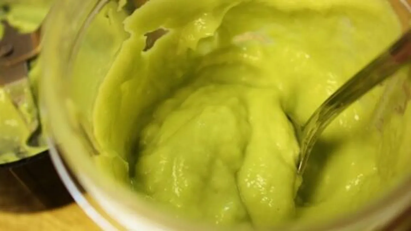 - خلط المكونات على سرعة عالية حتى تتجانس المكونات معاً، ثمّ إضافة الزيت بالتدريج، حتى تتشكل عجينة سميكة وناعمة.