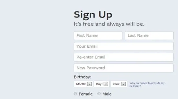 - اذهب إلى موقع Facebook.com وقم بتعبئة البيانات الخاصّة بك في وسط الشاشة كمستخدم جديد، وتشمل هذه البيانات على الاسم الأوّل، واسم العائلة، وبريدك الإلكترونيّ التي تمّ ملئها قبل قليل أو رقمك الخليوي سيكتب مرتين لتأكيد طلبك، وكذلك البريد الإلكترونيّ الخاصّ بك للتأكّد من عدم وجود خطأ فيه، والرقم السري الخاصّ بك، وتاريخ الولادة، والجنس، وبعد ذلك الضغط على تسجيل.