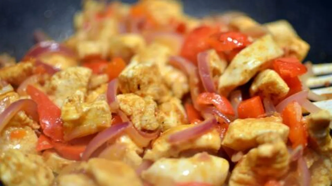 - نضع مقدار ملعقتين من الزيت النباتيّ في مقلاة، ثم نُضيف صدر الدجاج المُقطّع على نار متوسّطة، ونقلّب لمدّة دَقيقتين.
