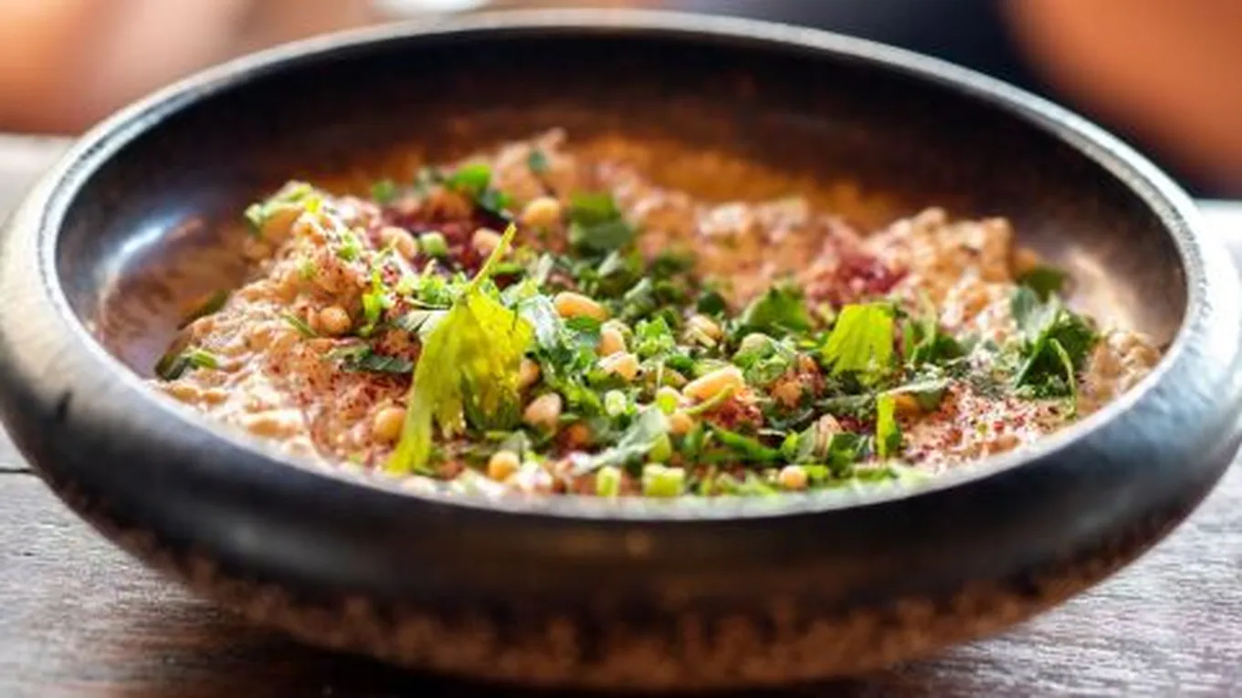 - وضع باقي كمية الحمص فوق الخبز، ثمّ إضافة الصنوبر المقلي.