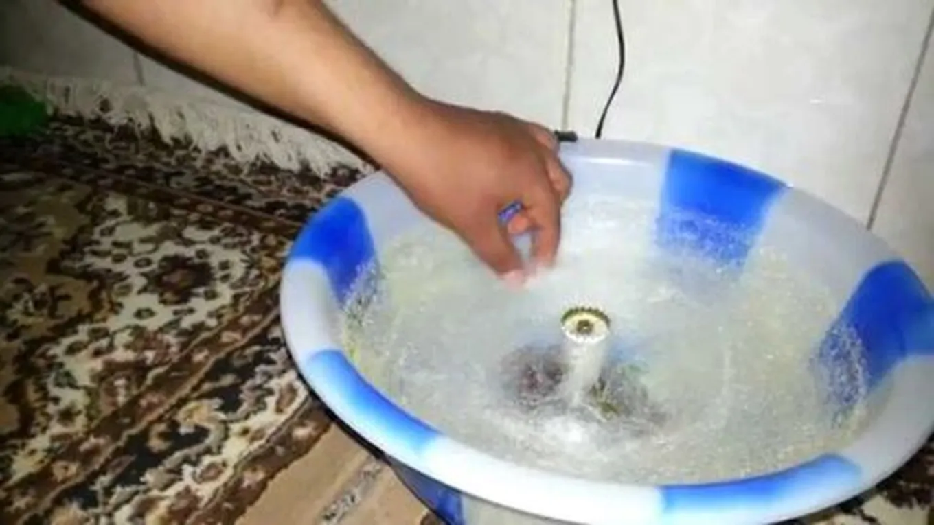 - يفك غطاء العبوة البلاستيكية عن العبوة، ثم يثبت الماتور بداخل الفتحة التي تمّ صنعها في الغطاء بحيث يكون رأس الماتور إلى الأعلى بينما يتدلى سلك الماتور نحو الأسفل.