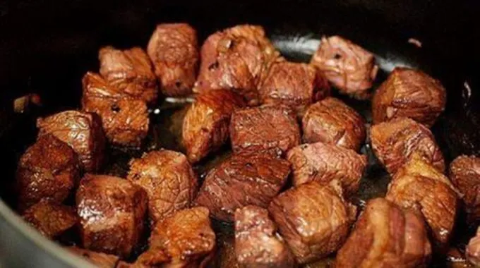 - نضيف اللحم المقطع إلى مربعات متوسطة الحجم أو صغيرة حسب الرغبة، ونقلبه جيداً مع البصل، ثمّ نضيف الثوم المهروس، ونستمرّ بتقليب المكوّنات مع بعضها البعض حتى يتغير لون اللحم.