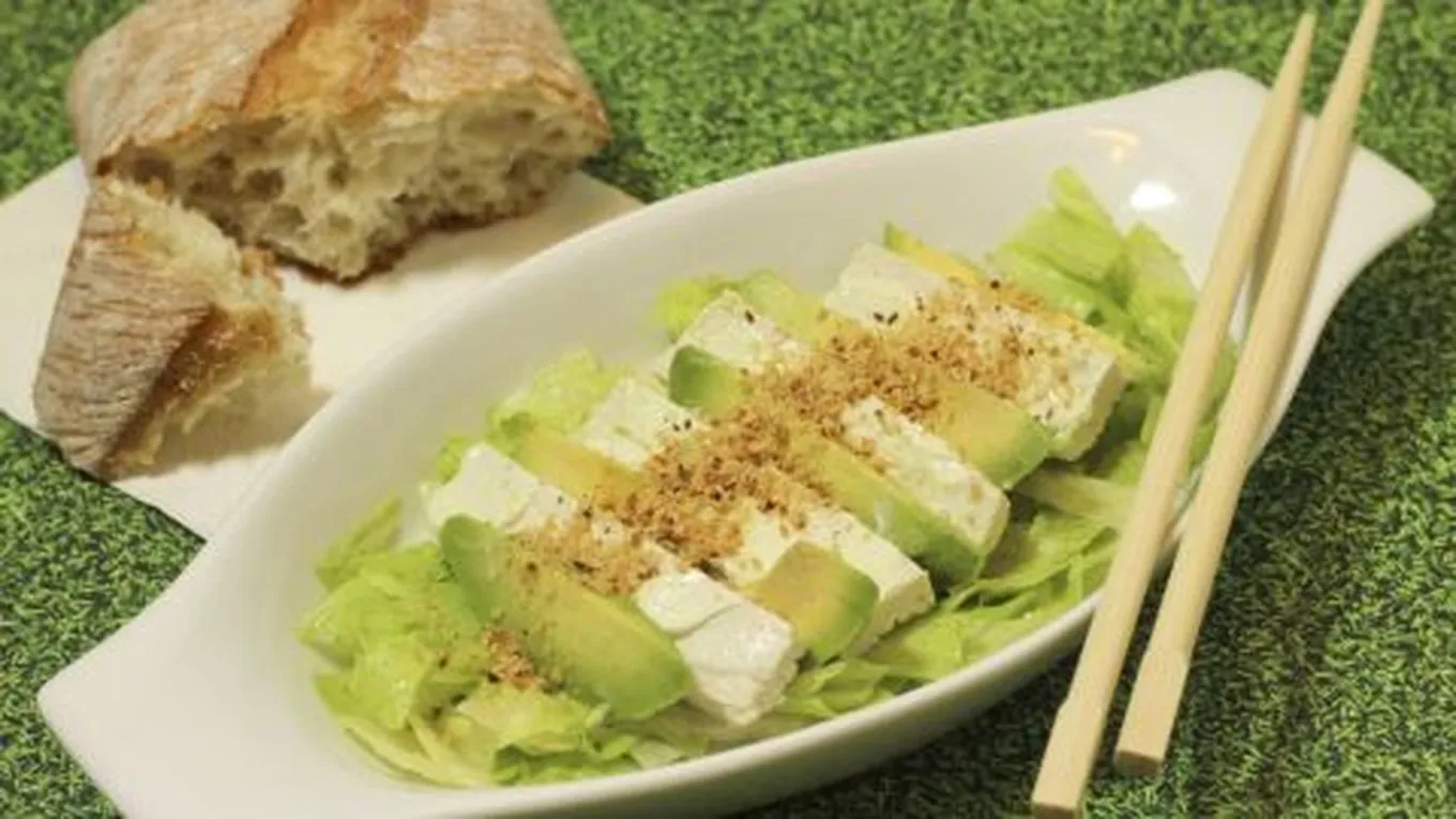 - ترتيب الأفوكادو، والطماطم، والذرة، والخس، والفطر في طبق كبير.