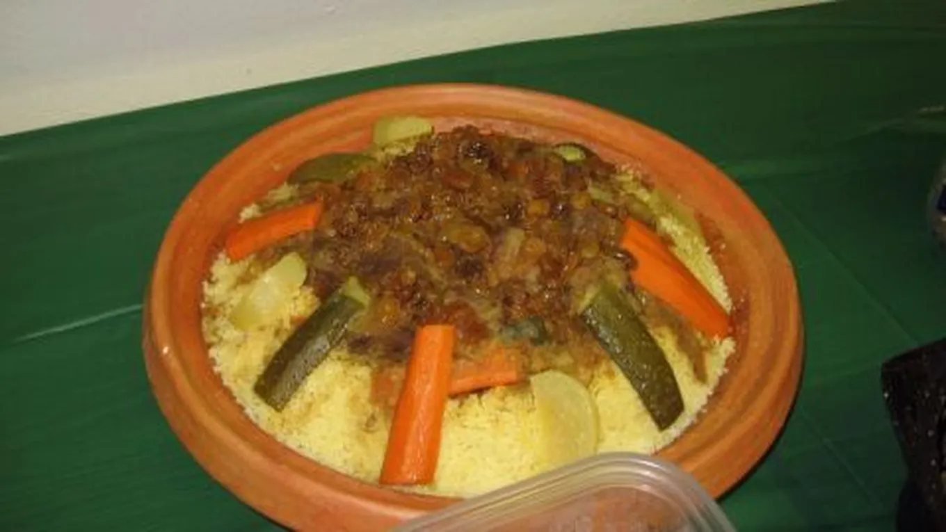 - سكب الكسكس في طبق واسع للتقديم، ثم إضافة طاجن اللحمة فوقه، وتزيينه بالصنوبر.