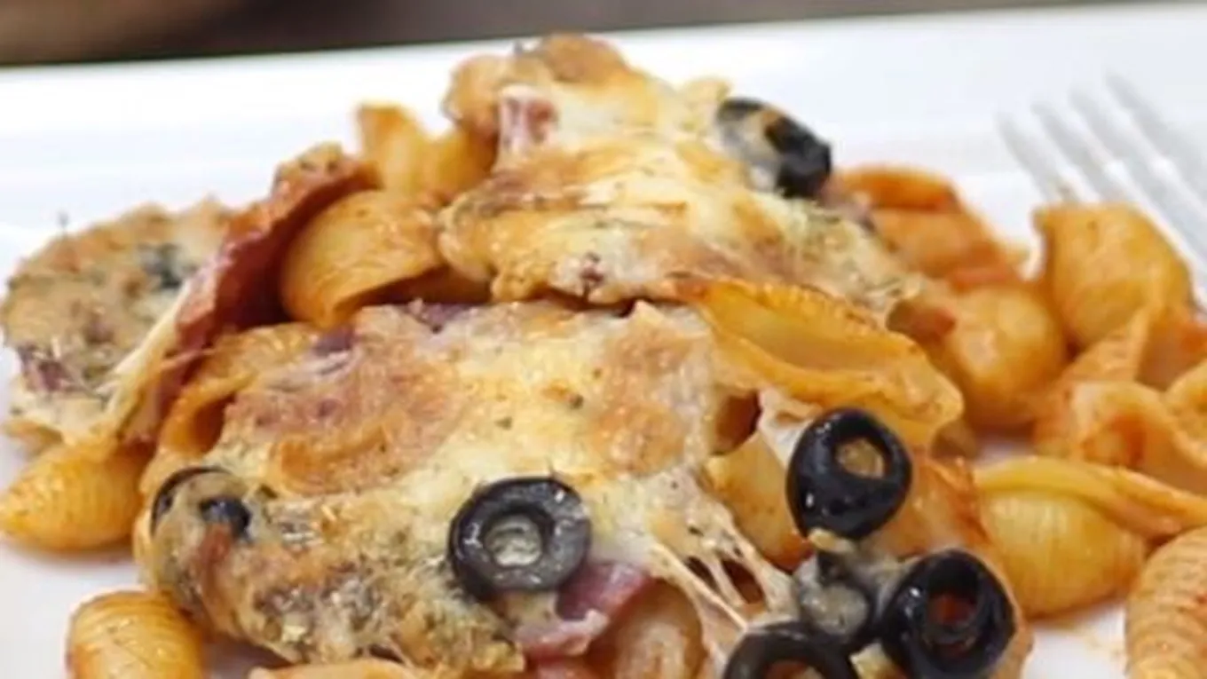 - نضع المعكرونة في صينيّة، ونوزّع صلصة البيتزا فوقها.