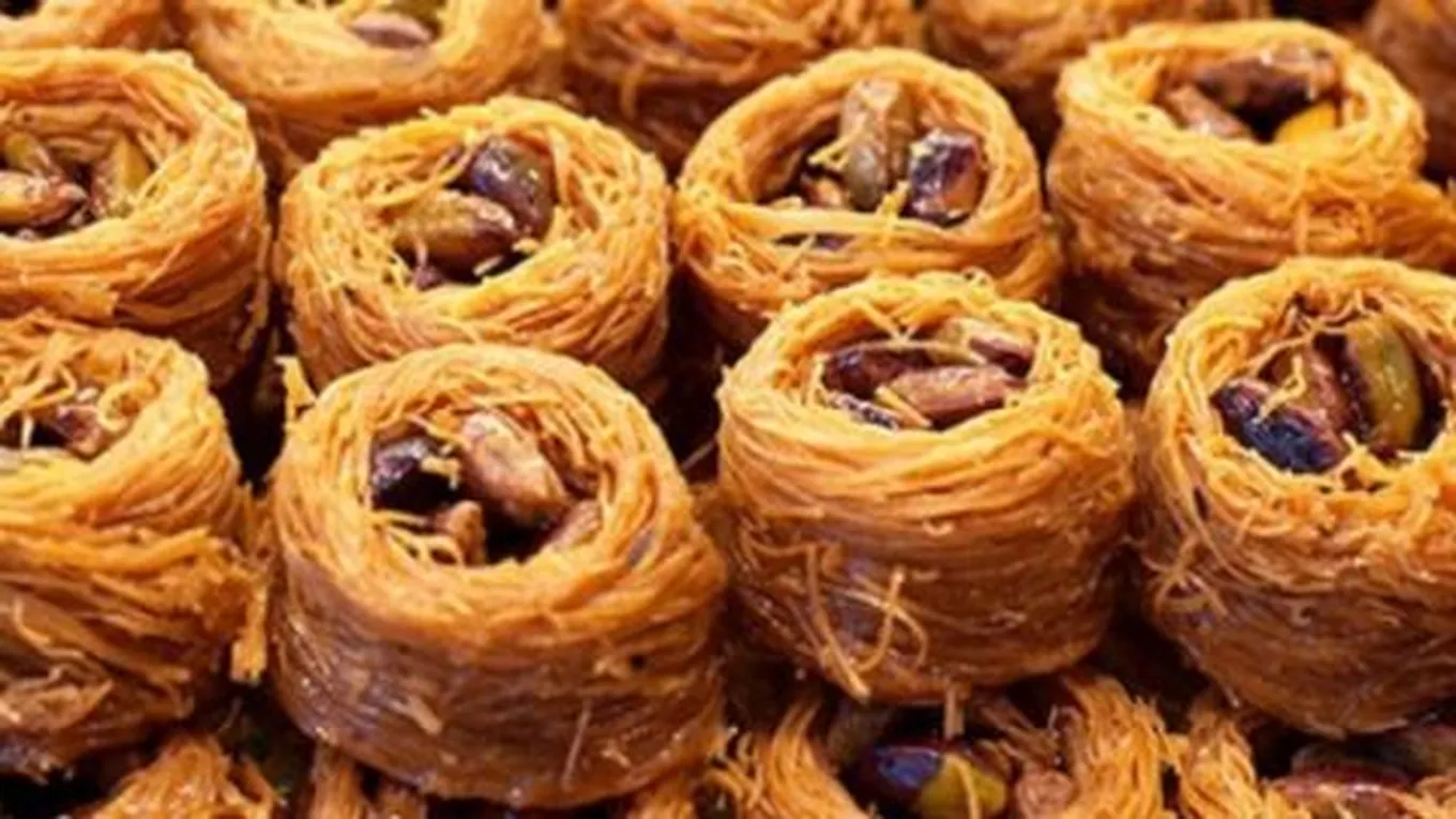 - ترصّ الأعشاش بصينية الفرن من ثم يتم وضح حبات من الفستق الحلبي داخل كل عش من ثم نسكب السمن المذاب الدافئ عليها بحذر من جميع الإتجاهات من ثم ندخلها إلى الفرن حتى تتحمر ويصبح لونها ذهبي وتحتاج من 20 إلى 30 دقيقة حتى تتحمر.