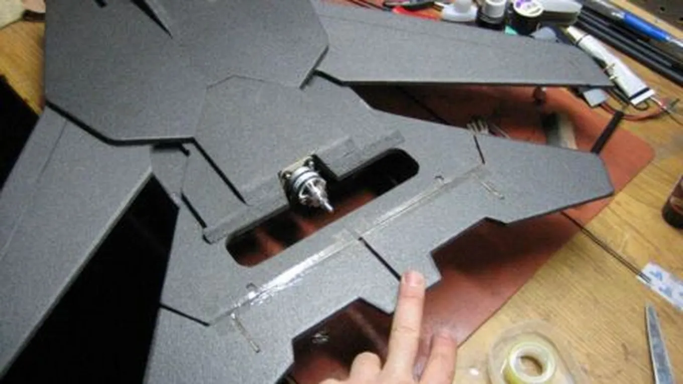 - باستخدام المشرط يتمّ عمل فتحة طولية في مقدمة الجزء العلوي لثلثي العبوة، ثم يثبت أحد الجناحين بداخلها، بحيث يكون الضلع الأكبر نحو الداخل والضلع الأصغر نحو الخارج.