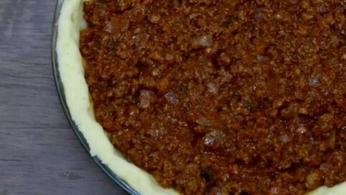 - وضع خليط اللحم في صينية واسعة مخصصة للفرن، ثم إضافة خليط البطاطس على وجهه.