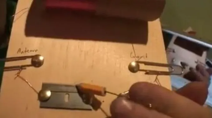 - من الطرف الموصول بين شفرة الحلاقة والأسطوانة الكرتونية قم بتوصيل سلك نحاسي طويل ومعلق بالهواء أو مستقبل التلفاز.