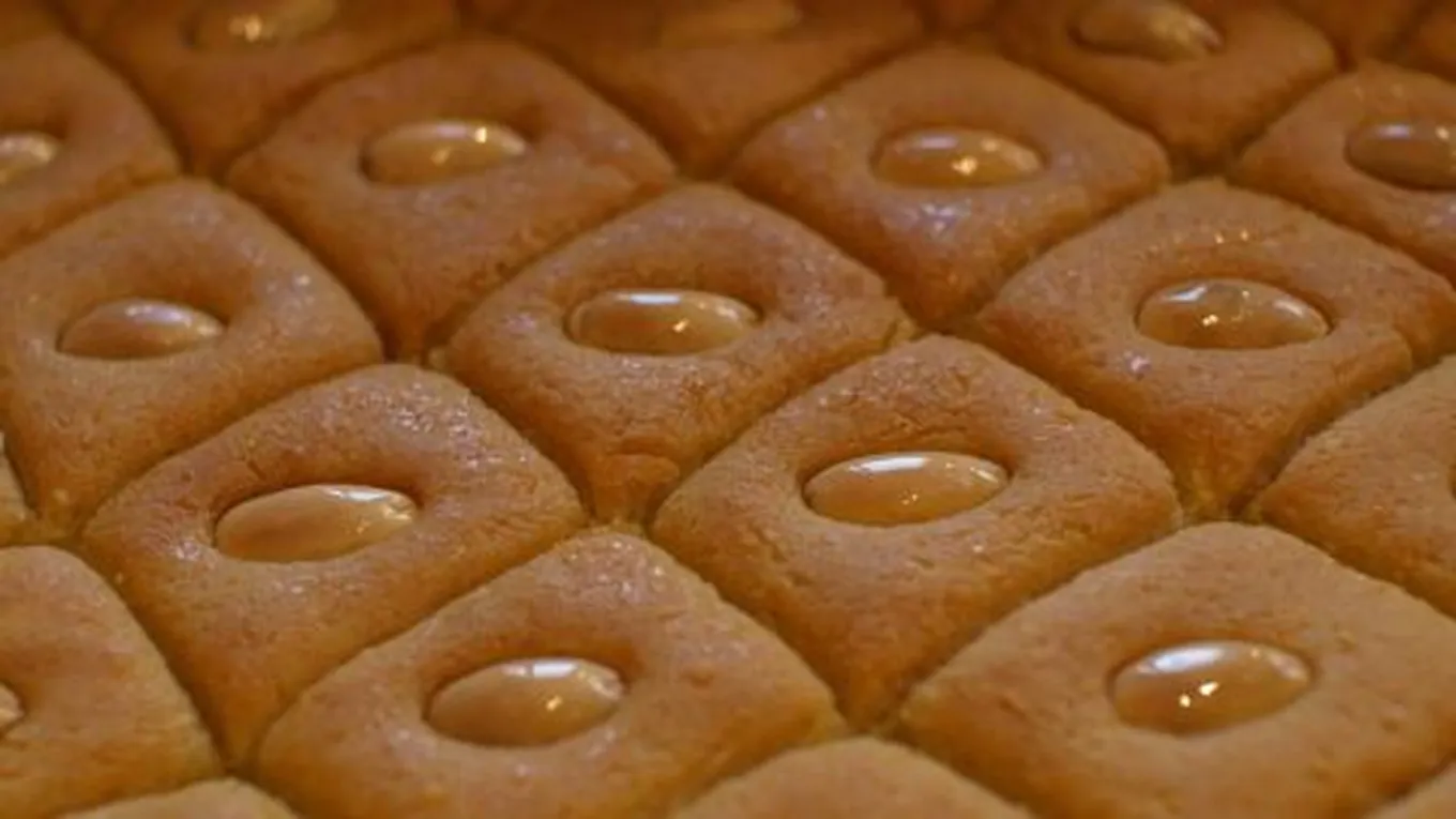 - إحضار صينية ودهنها بالطحينة والزيت النباتي وسكب عجينة السميد في الصينية وتسطيحها ثمّ ترك عجينة السميد لمدة خمس دقائق حتى ترتاح.