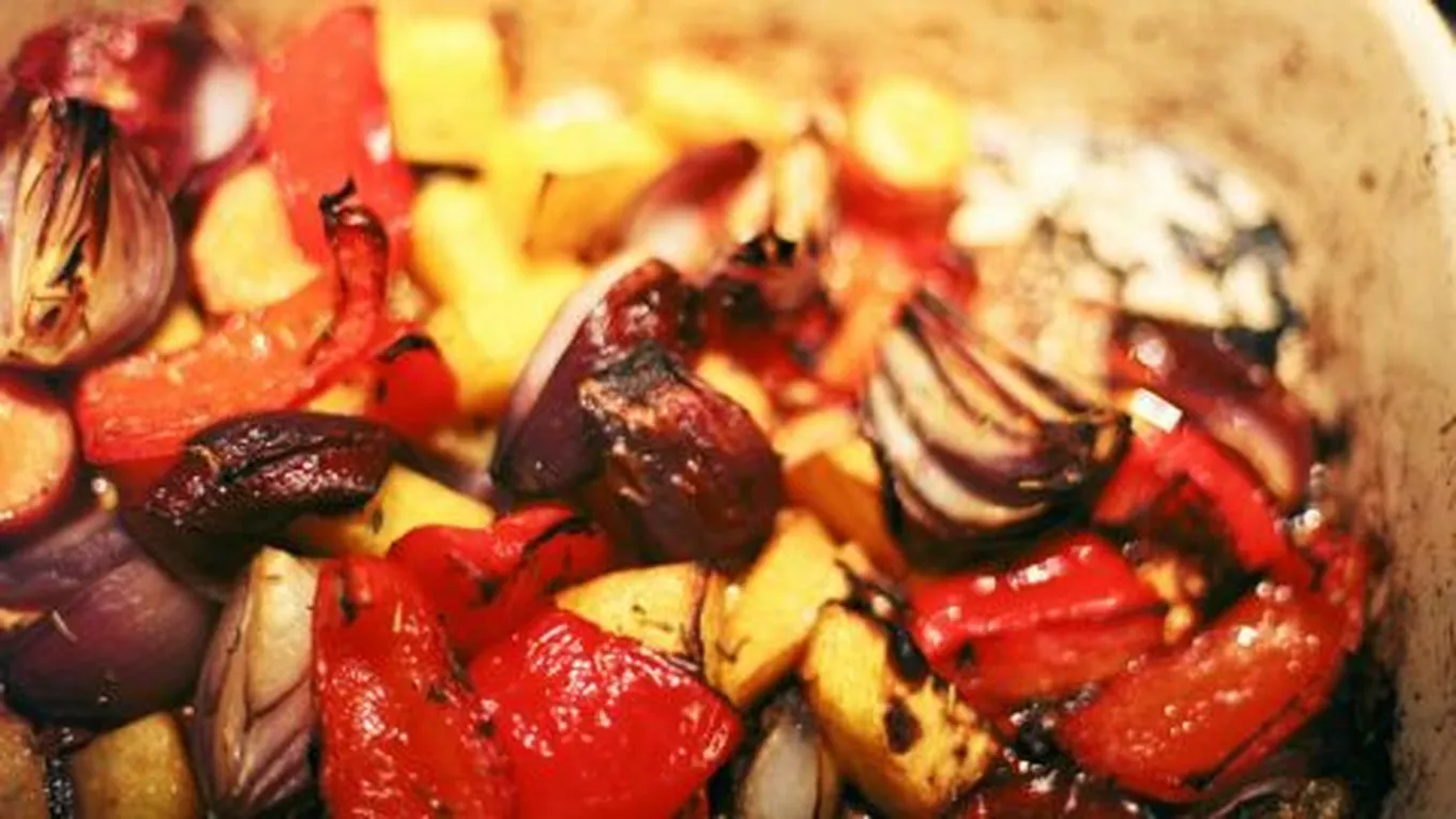 - ارفعي الإناء عن النّار واسكبي خليط الخضار في صينيّة البايركس، وأدخليها إلى الفرن لتتحمّر مدّة عشر دقائق.