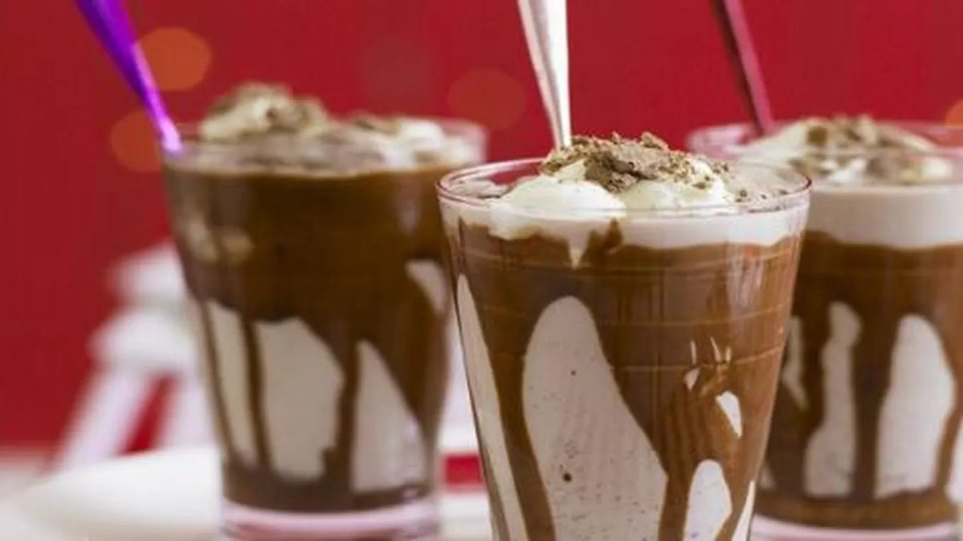 - اسكب مزيج الآيس شوكلت في كؤوس زجاجية كبيرة الحجم.