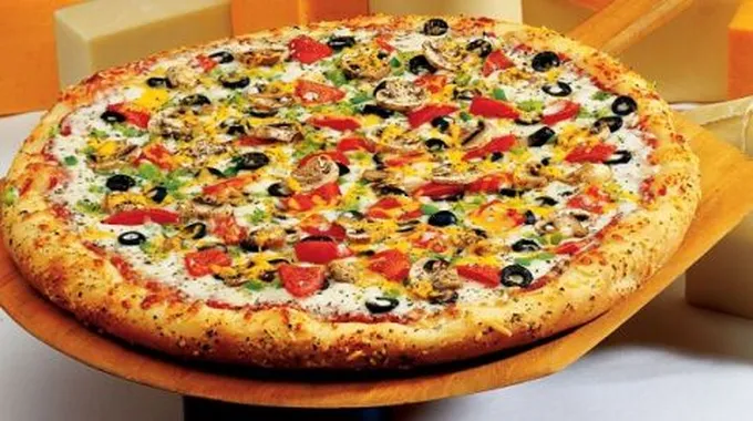 - إخراج الصينيّة من الفرن، وتقديم البيتزا ساخنةً، بجانب طبقٍ من البطاطا المقليّة، والزيْتون.