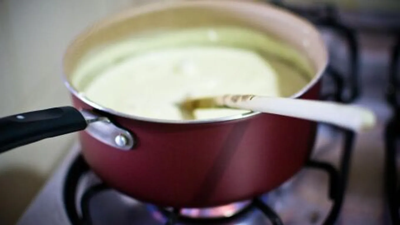 - إضافة كلٍ من: الحليب، ومكعب المرق، والفلفل، والقرفة، وخليط الطحين والنشا وتقليب الخليط على نار متوسطة الحرارة حتى تتكون صلصة سميكة القوام.