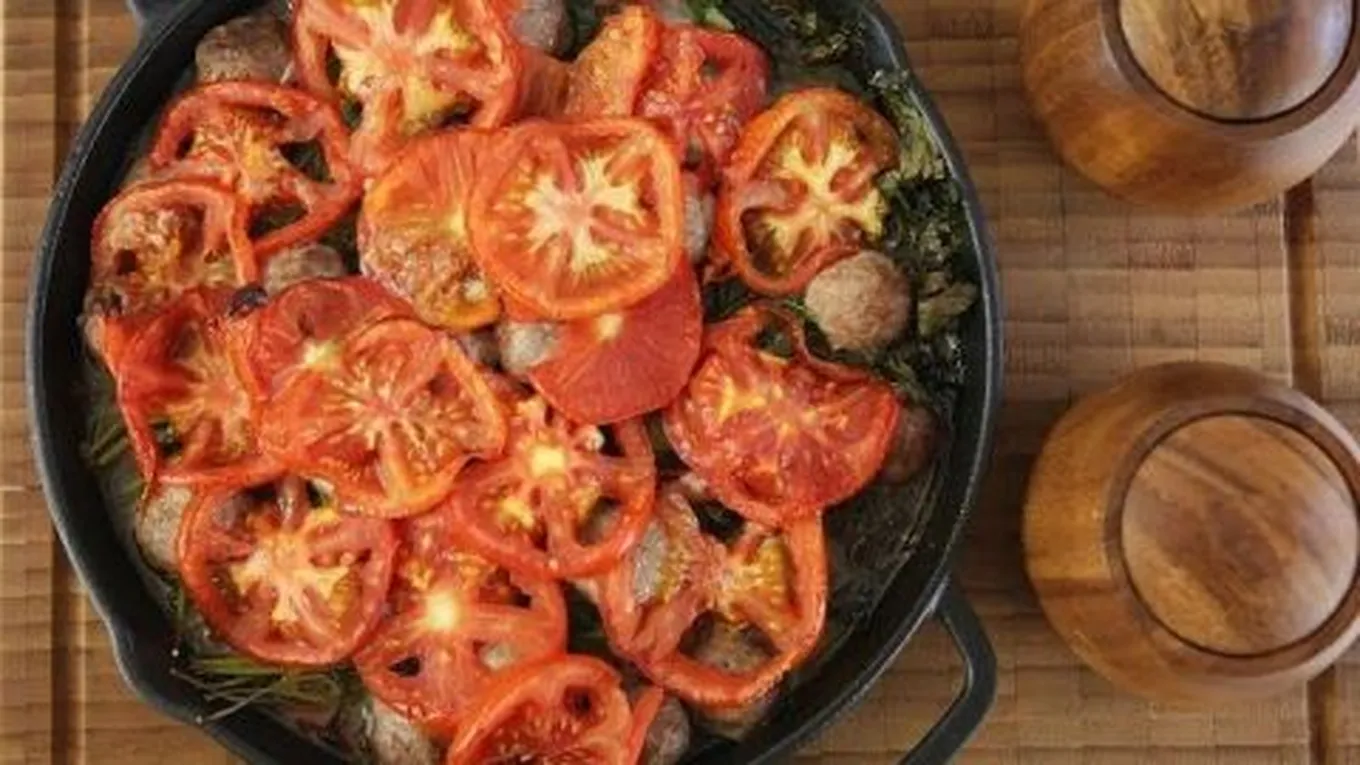 - نقطع الطماطم على شكل دوائر، ثم نرصها فوق طبقة الكفتة.
