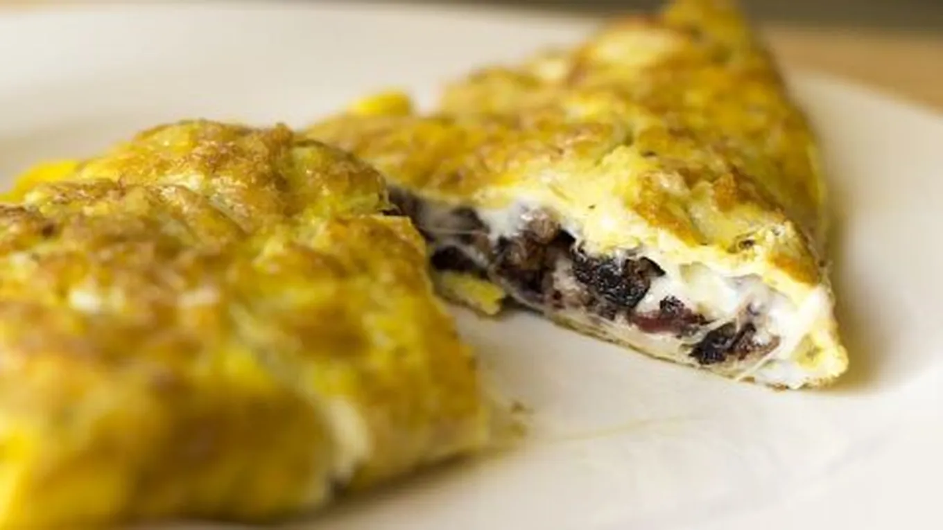- إزالة عجة البيض باللحم عن النار ثمّ وضعها في طبق التقديم وتقديمها مع الخبز العربي.