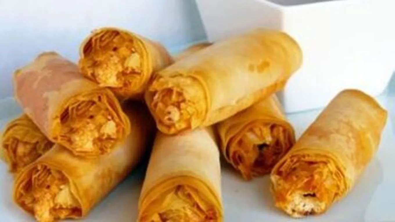 - لفّي الرقاقة فوق الحشو على شكل إصبع، مع مراعاة ترك شعيرات الكنافة خارجة من جانبي الرقاقة.