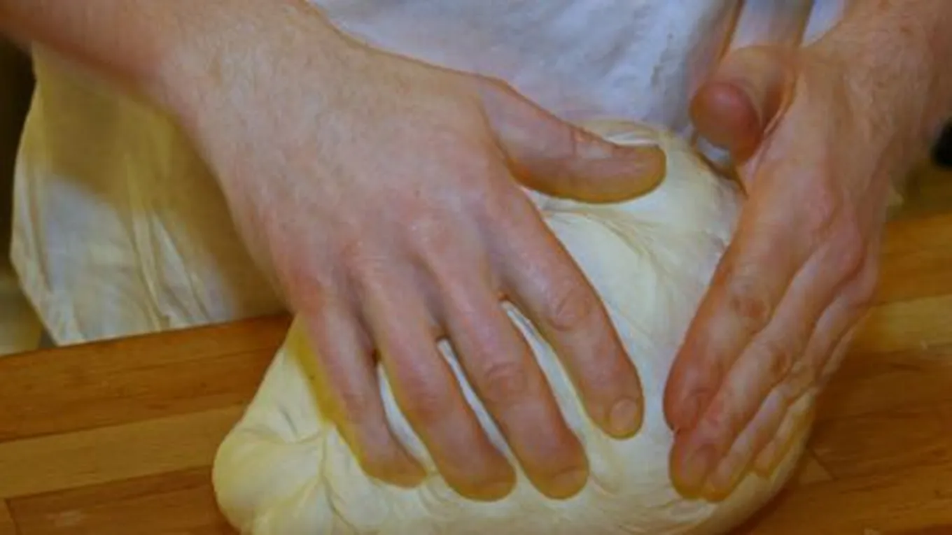 - نضيف المزيج إلى خليط السكر والخميرة، ثم نضيف الدقيق إلى المكوّنات، ونعجن جيداً حتّى نحصل على عجين متماسك.