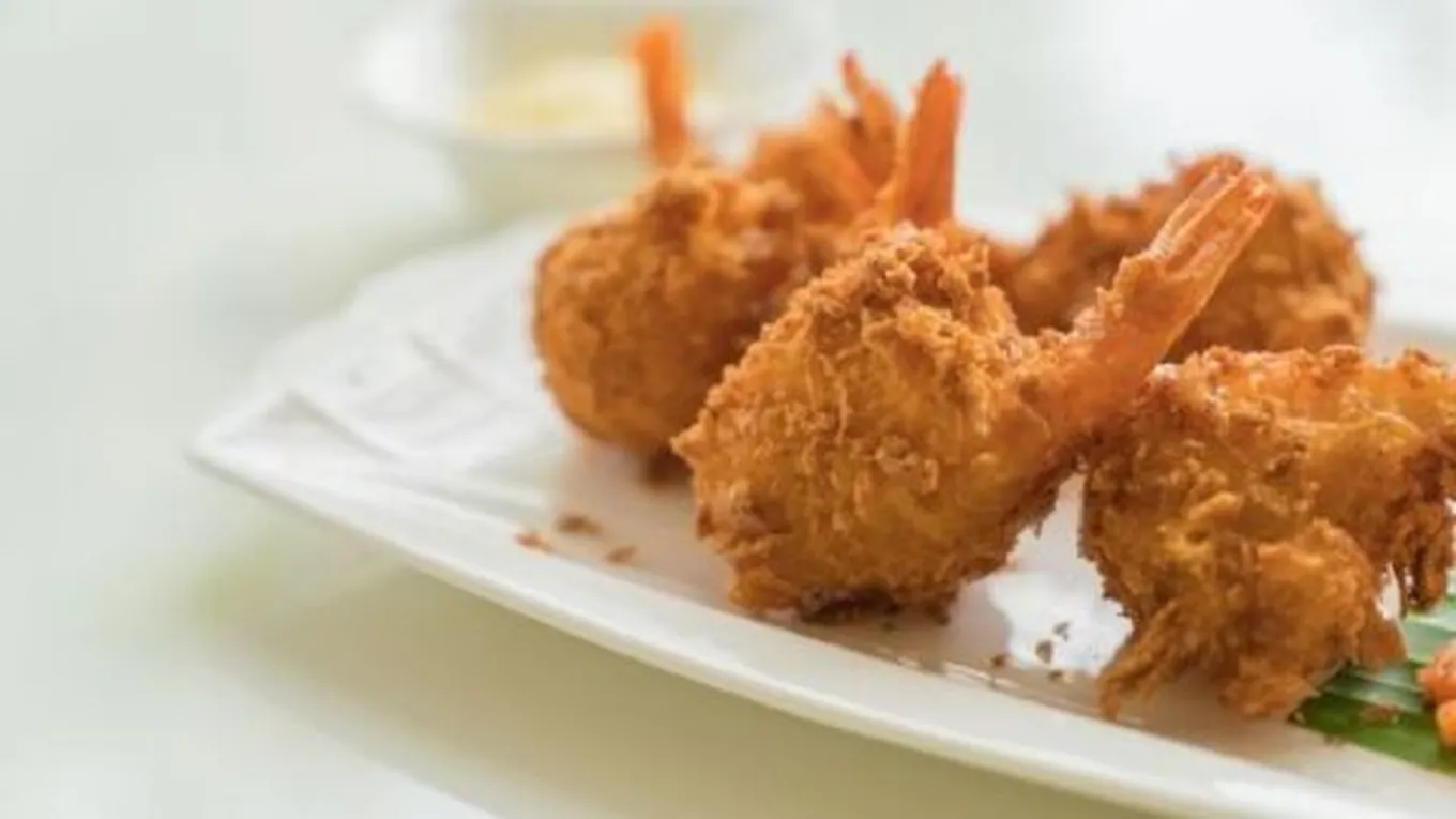 - تغليف كل قطعة من الروبيان بالطحين ثمّ بالصلصة ثمّ بخليط جوز الهند على التتالي.