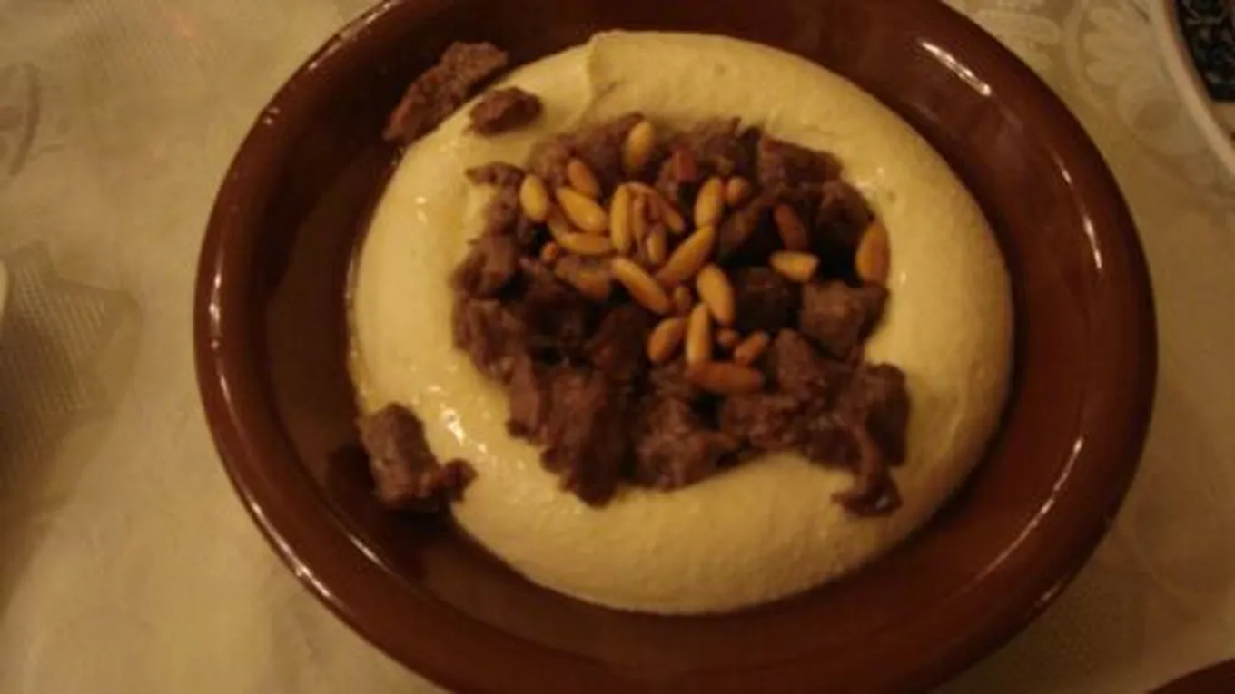 - وضع الحمص في طبق التقديم، وتزيين الوجه بالصنوبر واللحم.