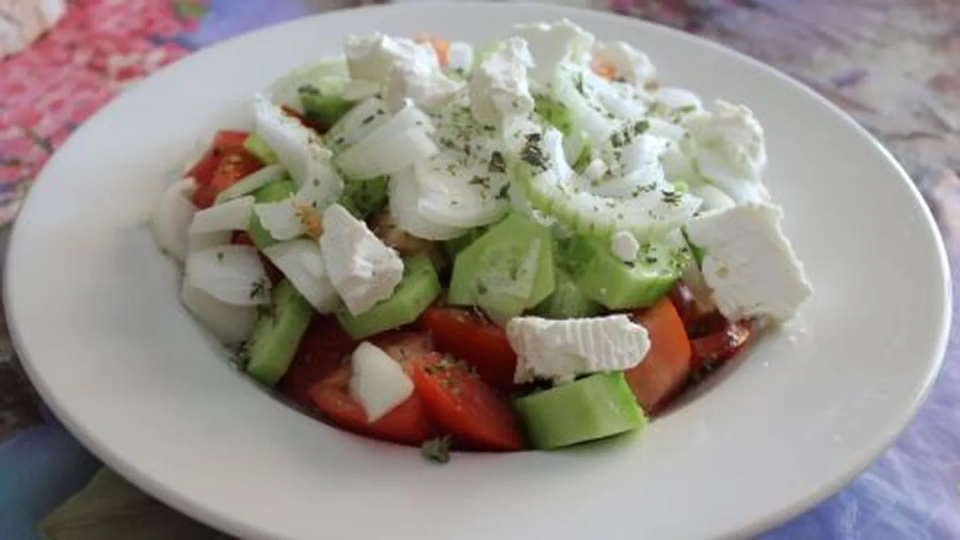 - سكب خليط السلطة في وعاء التقديم وتزيينه برش شرائح البصل والزيتون وجبنة الفيتا على الوجه.
