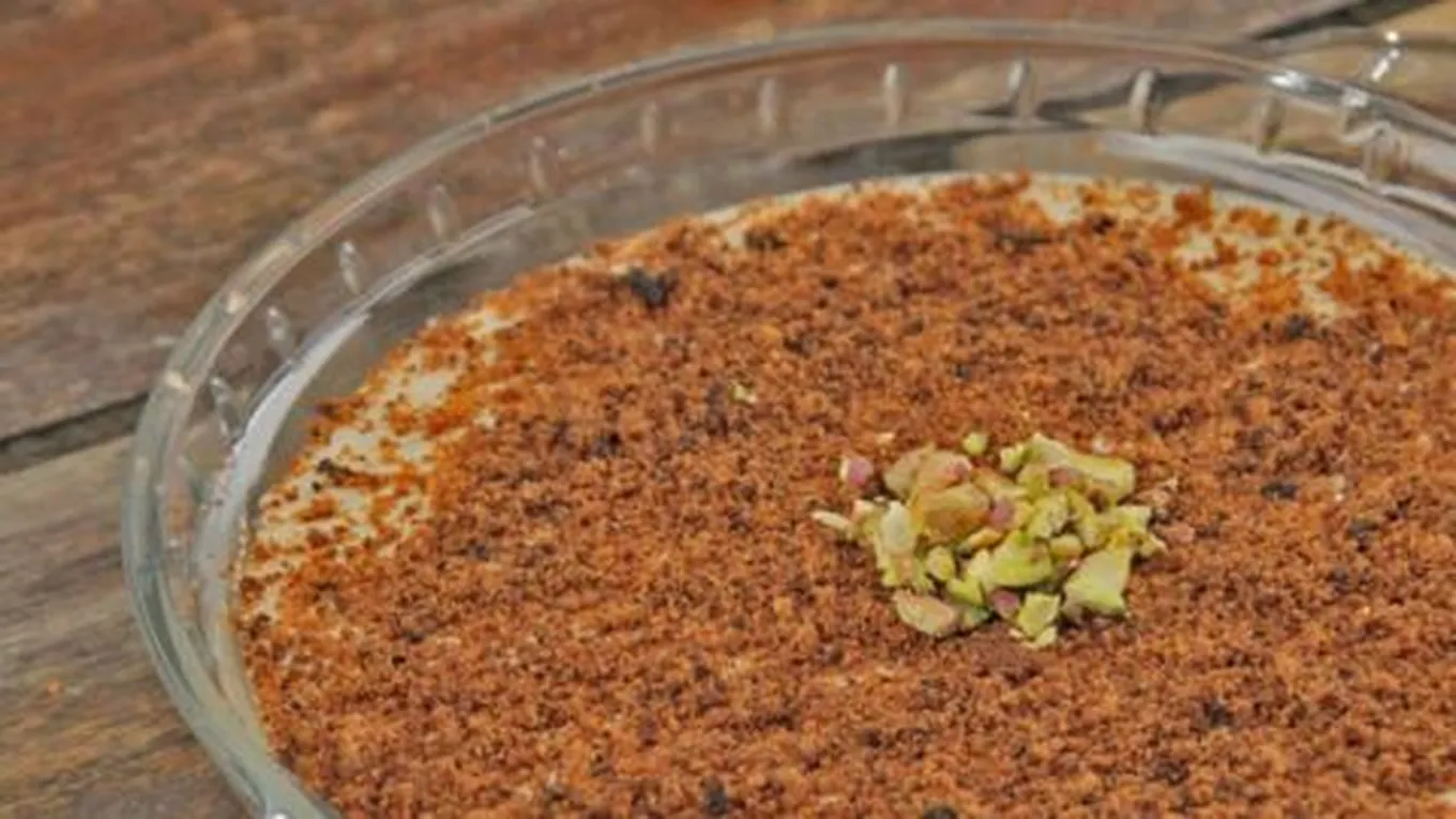 - إضافة المقدار المتبقي من البسكويت المطحون فوق خليط القشطة.