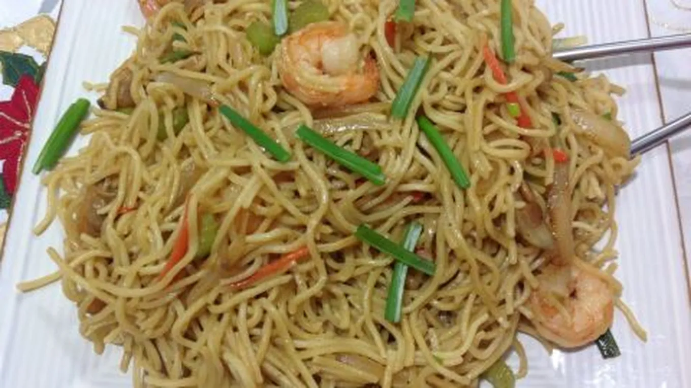 - نضع النودلز في طبق التقديم ونزينه بالبصل الأخضر، والبضة بعض تقسيمها إلى نصفين.