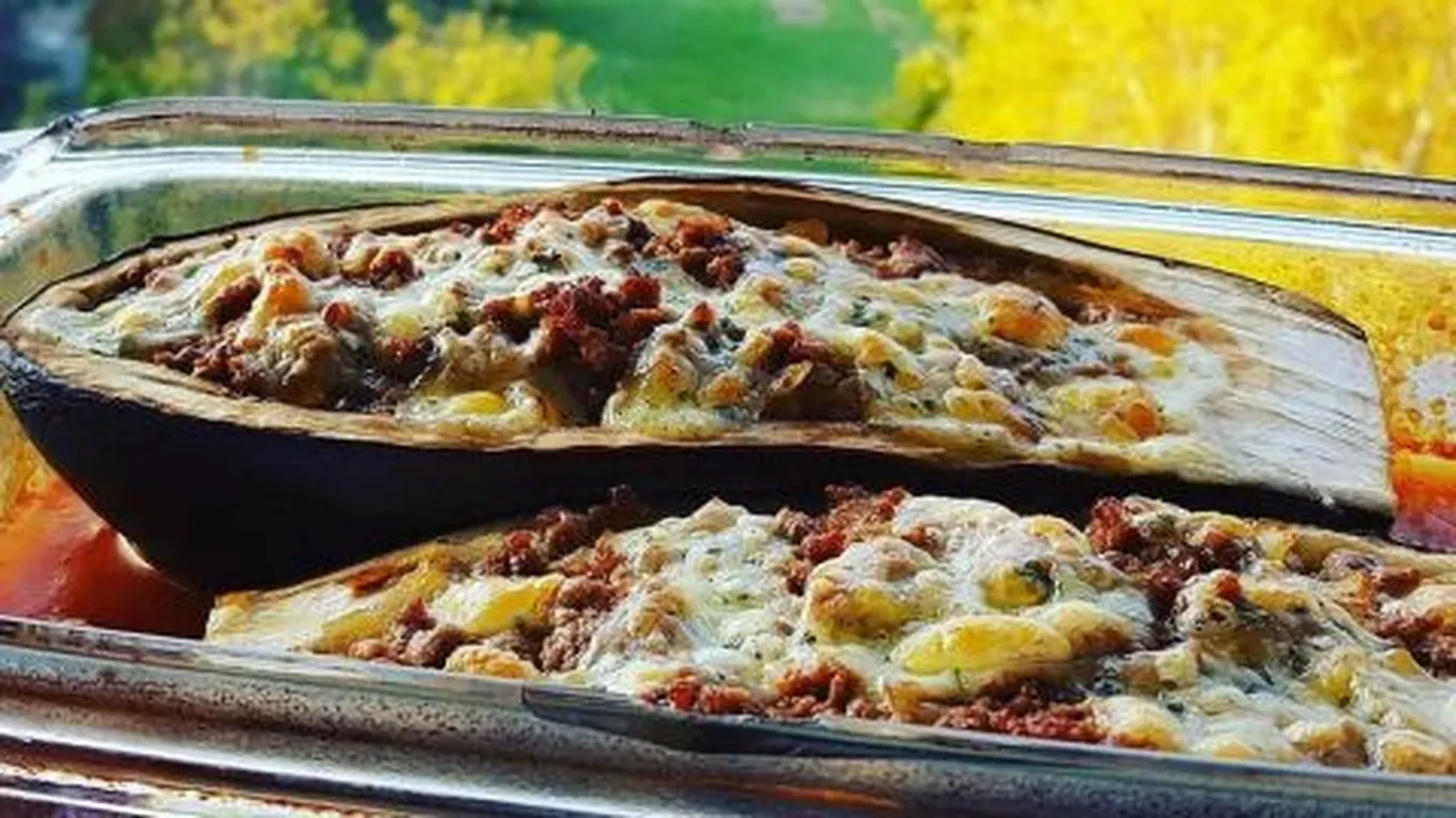 - نضيف الكمية المتبقية من الباذنجان على خليط اللحم.