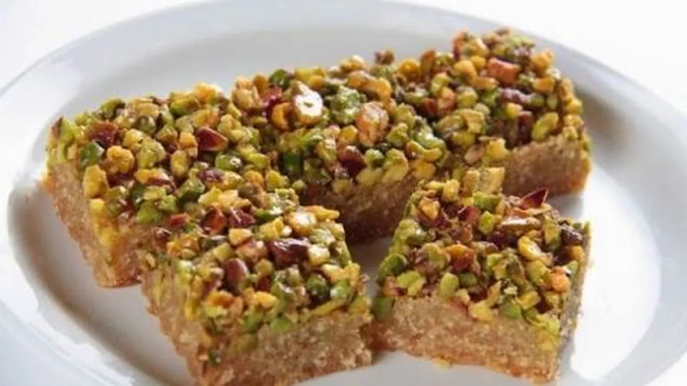 - نترك المزيج يبرد بعد أن نتأكّد من أنّ السميد اختطل بالسكر تماماً، ثمّ نمده في الصينيّة بالتساوي، ونخلط كوبَي الفستق الحلبي مع نصف كوب القطر ونخلط جيداً ثمّ نفرشه على السميد.