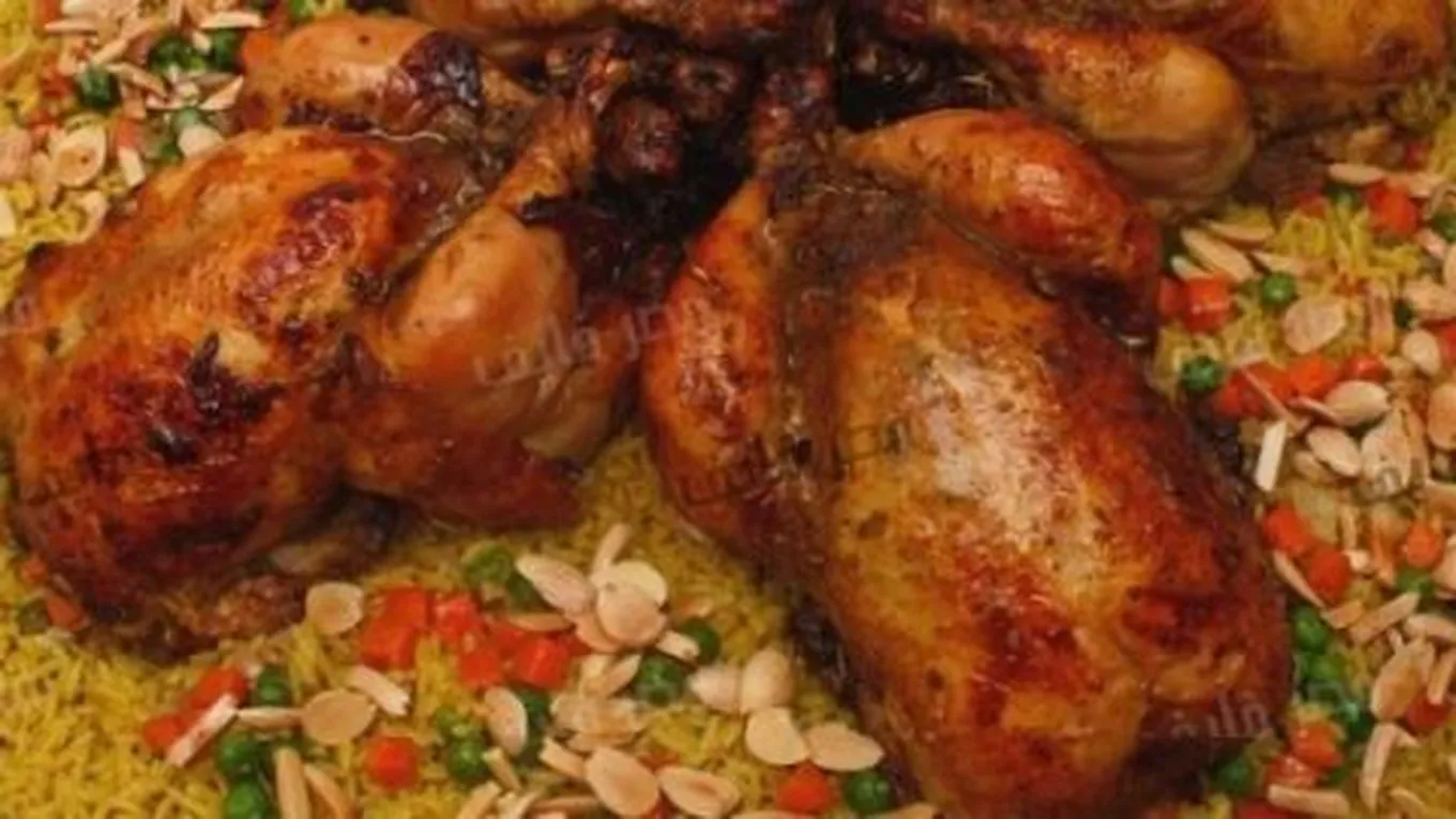 - نحمّر قطع الدجاج في الفرن، ونوزّعها على وجه الطبق.