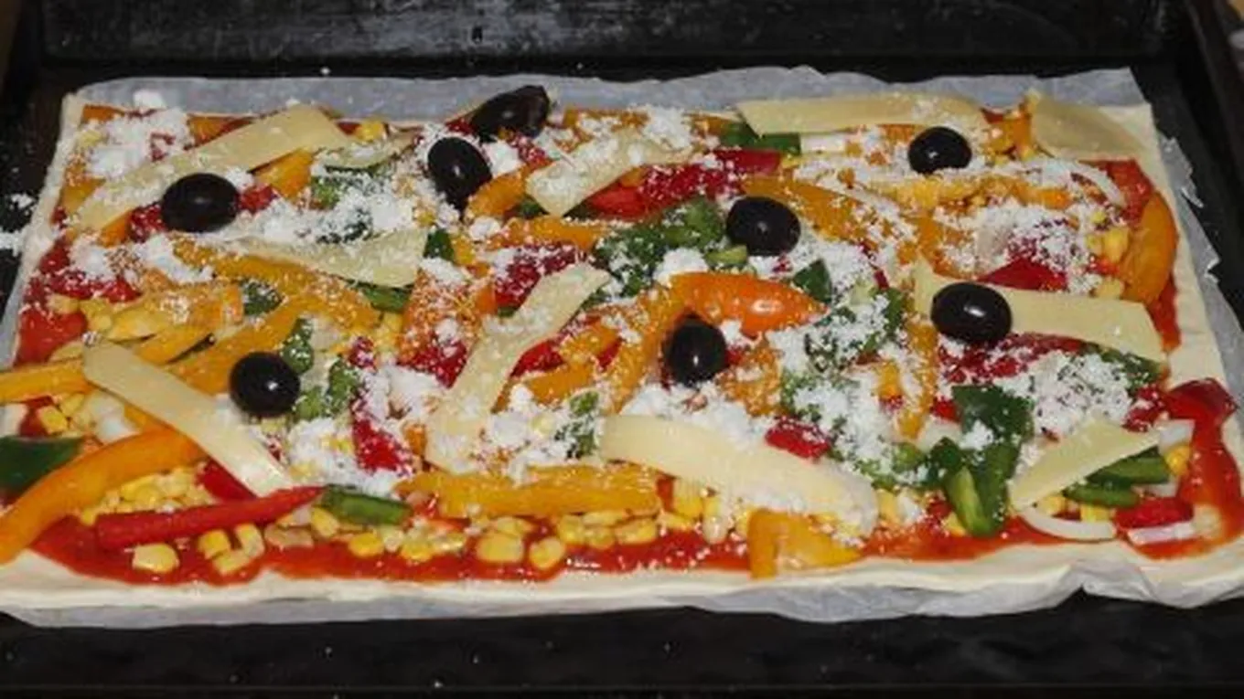 - نفرد صلصة البيتزا على كل عجينة، ثم نُوزع الفليفلة، والبصل، والطماطم، والفطر على الوجه.