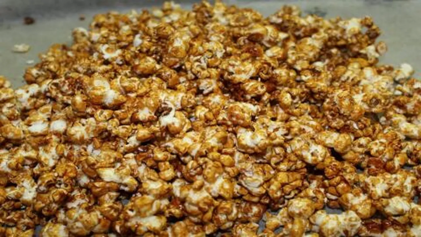 - نضع الذرة في قِدر كبيرة وعميقة غير لاصقة، ونضيف له الزيت النباتي والسكر والماء ونضع القِدر على نار متوسّطة الحرارة مع التحريك المستمر حتّى يذوب السكر.