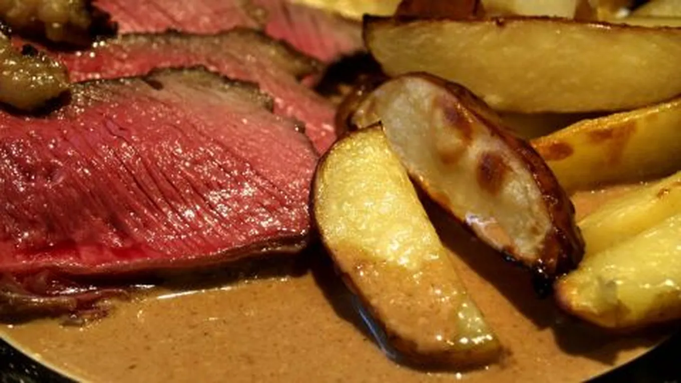 - وضع نصف كمية البطاطس في طبق مخصص للفرن، ثم وضع اللحمة فوقها وتوزيع الجبنة فوقها.