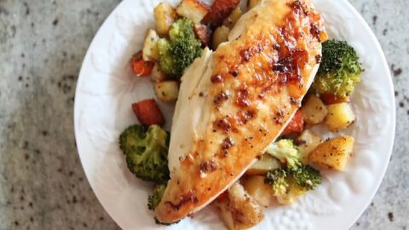 - نُخرج الصينية، وننزع ورقة القصدير، ثمّ نضيف قطع الدجاج فوق الخضار.