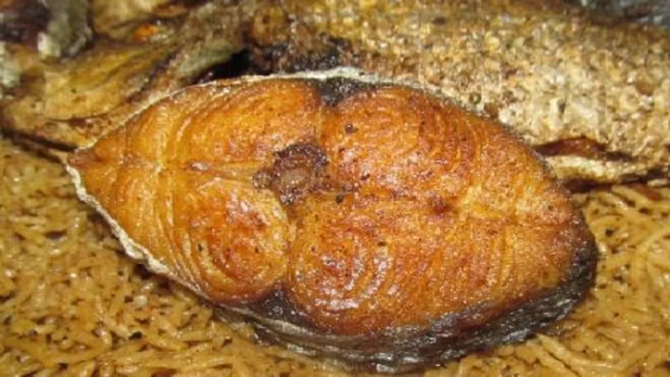 - نسكب الأرز في طبق التقديم، ونضع القطع المقلية من السمك عليه، ثم نزينه بالبصل المقلي، ونزينه أيضاً بكل من الصنوبر واللوز المحمرين، وتقدم هذه الأكلة ساخنة.
