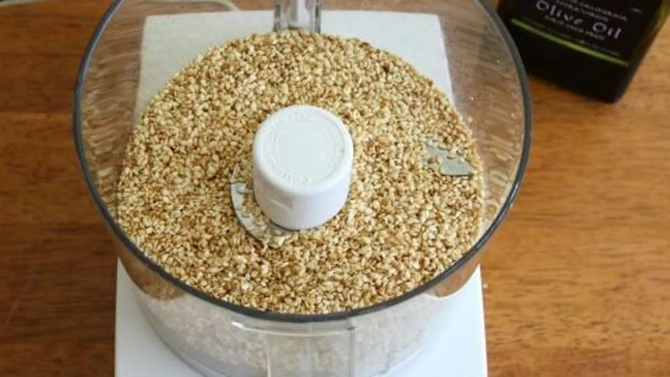 - نضع السمسم في وعاء الخلاط الكهربائي ونطحنه جيداً.